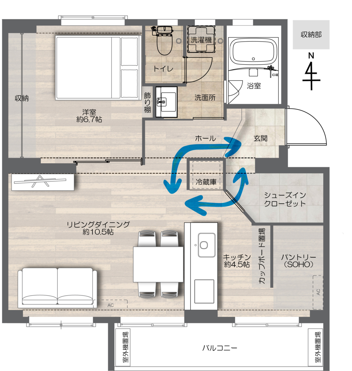 さらに、ケーススタディハウスでは土間収納があることで、玄関からキッチンへ直接アクセスできる回遊性を実現しました。これにより、買い物から帰ってすぐに食材を冷蔵庫にしまったり、生活ごみを一時的に置いたりすることができ、利便性が高まりました。